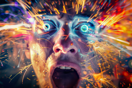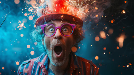 A person with wide eyes and an open mouth appears astonished, surrounded by a dazzling array of colorful sparks. The atmosphere is electrifying, capturing the excitement of a lively celebration.