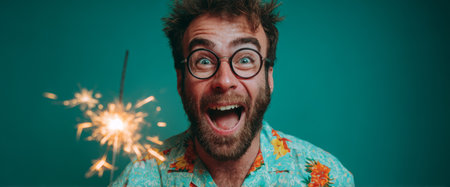 A cheerful man wearing a colorful shirt holds a sparkler, smiling broadly. His excitement is evident as the sparkler lights up the background, creating a festive atmosphere.