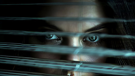 Mysterious woman with intense eyes looking through blinds in a dark setting, creating a suspenseful and intriguing atmosphere