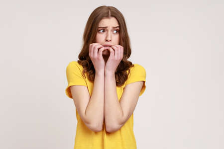 Anxious nervous female of young age with brown hair in T-shirt biting nails on fingers looking aside with terrified expression, confused and worried. Indoor studio shot isolated on gray background.