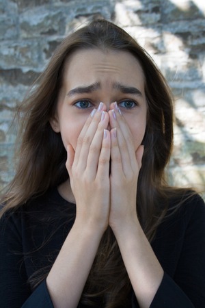 Teenaged girl with hands to mouth and wide eyes in expression of fear wearing black shirt on black background