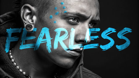 A bold portrait of a young man with electric blue words FEARLESS splashed across his . His intense expression and piercings contrast strikingly with the matte black background.