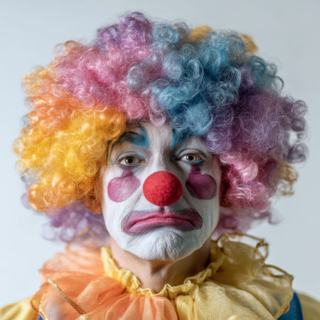 A sad clown with a colorful wig displays a complex emotion, highlighting the contrast between joy and sadness in performance art and entertainment culture.