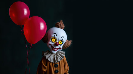 A creepy clown with glowing eyes and red balloons against a dark Halloween background. AI generation