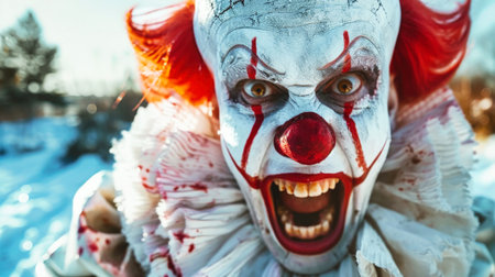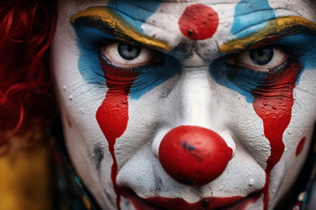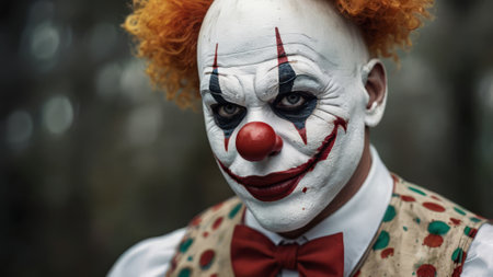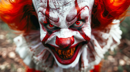 A close view of a scary evil clowns face, featuring red hair and exaggerated makeup, creating an eerie and unsettling appearance.