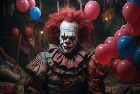 Close-up portrait of a scary clown with balloons. Halloween.