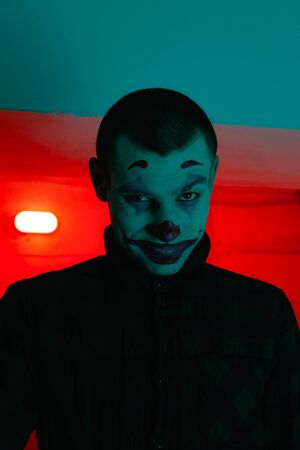 Close-up portrait of a joker man. Stock photo makeup joker in a horror room.
