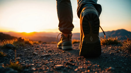 close-up of hiking boots on a trail at sunset