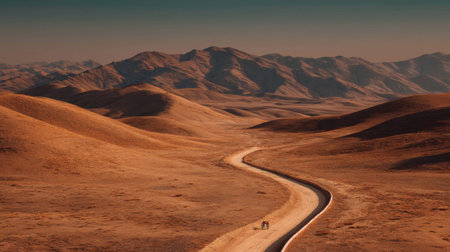 A breathtaking view of a winding road meandering through a vast desert landscape, framed by distant mountains and bathed in the warm glow of golden hour light.