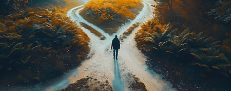 Man at two roads deciding for best chance of environment protection. superlative generative AI image.
