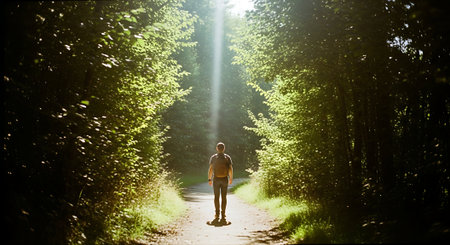 A man radiates a soft glow as he walks through a lush forest, surrounded by vibrant greenery and a winding trail. The atmosphere is tranquil and otherworldly.