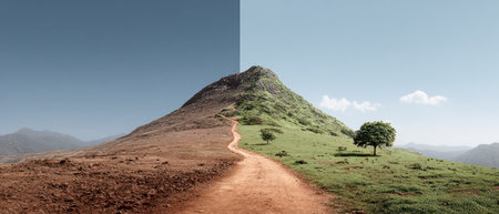 Sustainable path to success is shown by dirt road leading up mountain with contrasting dry and green landscapes under clear sky.