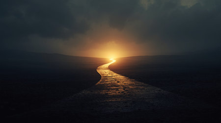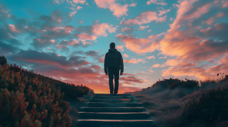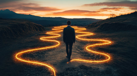 A solitary man walks along a winding path illuminated by glowing lights, set against a breathtaking sunset backdrop. Perfect for themes of journey and inspiration.