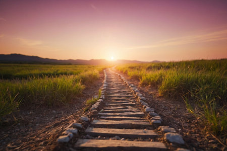 A worn stone path stretches through grassy fields under soft light during sunset, inviting exploration in the fading day.
