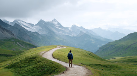 Backpacker enjoying breathtaking scenery while hiking on a winding path through lush green meadows, leading towards majestic snow capped mountain peaks under a cloudy sky