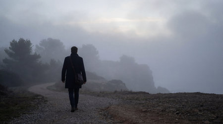 Solitary traveler walking along path in misty foggy landscape. Moody atmosphere wallpaper. Nature journey solitude.