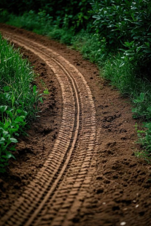 Tire tracks on a dirt road in the countryside of Thailand.