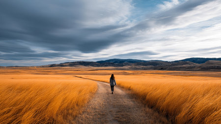 A traveler walks along a winding stone path through a vibrant green field filled with wildflowers, capturing the essence of outdoor adventure and tranquility.