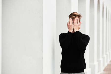Male model in black pullover covers his face with his hands standing in the background white columns in the old town. Men's style, beauty. Fashion shot.