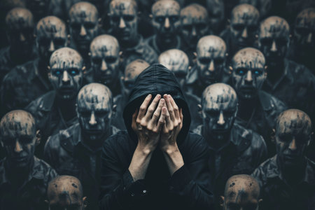 A calm figure stands at the center, surrounded by a multitude of faces silently screaming, highlighting a powerful contrast of emotions and tension.
