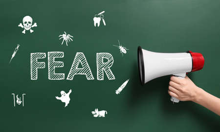 Hand with megaphone, word FEAR and drawings of different phobias on green background