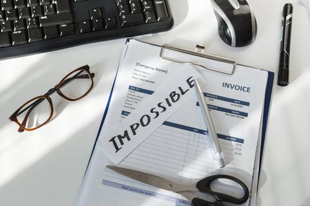 Brainstorming. Impossible word on workplace of sales manager with document invoice
