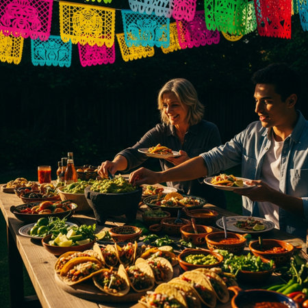 Outdoor Mexican feast at sunset with tacos and refreshments. That the image is generated using AI.