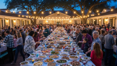 A panoramic (16:9) cinematic extreme wide shot of a large community potluck dinner held in a histori
