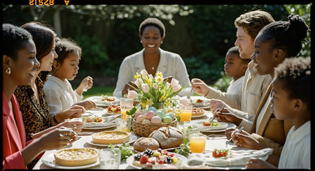 A diverse family gathers around a table for a festive Easter meal in a lush outdoor setting.