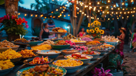 An inviting spread of diverse food items is showcased, promising a delightful culinary experience. The scene is illuminated by numerous warm string lights, casting a magical glow and fostering a cheerful ambiance. People are visible in the background, suggesting a lively social event or market. The focus is on the abundance and presentation of the food, hinting at a celebration or communal dining occasion.