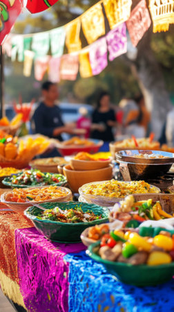 A vibrant table filled with an array of delightful dishes, showcasing a colorful and festive dining experience perfect for celebrations and gatherings.
