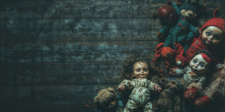 Group of scary dolls lying on a wooden floor with copy space, perfect for a halloween banner