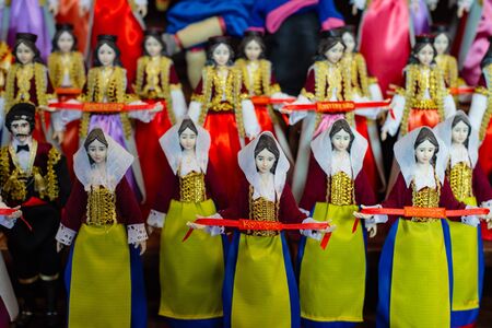 Bansko, Bulgaria - June 17, 2016: Variety of traditional bulgarian souvenir dolls in national costumes on the table