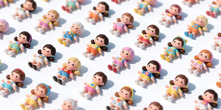 A repeating pattern of small plastic doll figurines showcasing different colorful outfits and hairstyles is scattered across the white surface with scattered shadows.