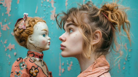 Face-to-Face Contrast Between a Young Woman and a Vintage Doll on Blue Background