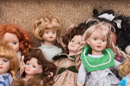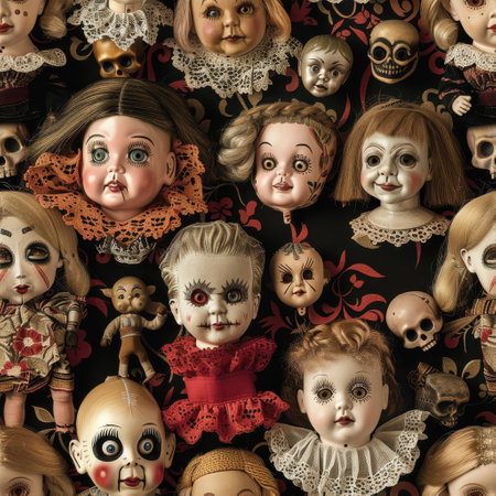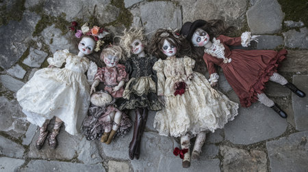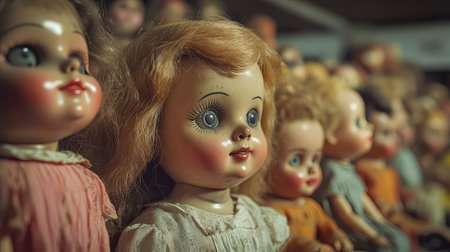 A group of old, creepy looking dolls are lined up in a row. The dolls are all different sizes and colors, but they all have the same creepy expression on their faces. Scene is eerie and unsettling