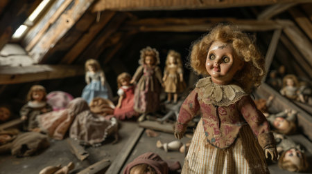 An eerie attic filled with old dolls, one's head ominously turned towards the camera