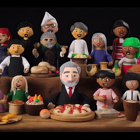 This vibrant artwork features a collection of handcrafted wooden figurines, symbolizing diversity and unity in a colorful display, perfect for community themes.