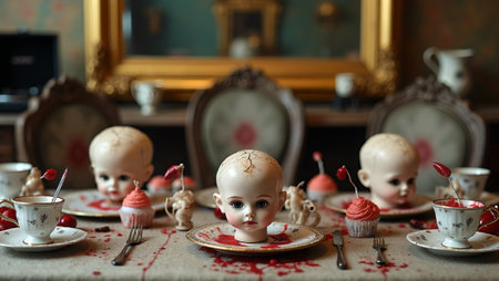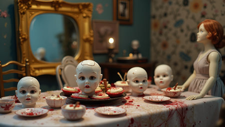 Eerie dollhouse Halloween party with cracked doll heads bloody cupcakes and vintage decor