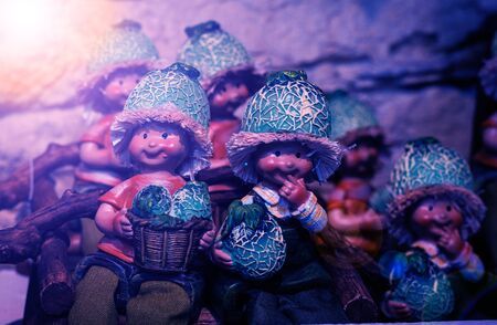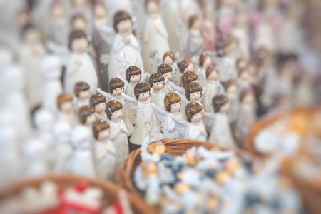 Christmas market with traditional wooden dolls on festive lights background, close-up