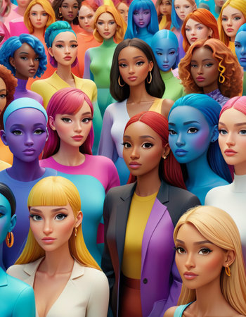 Group of people are standing in a line, with some wearing hats and sunglasses. The people are of different colors and sizes, and they are all lined up together. Concept of unity and diversity