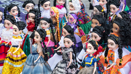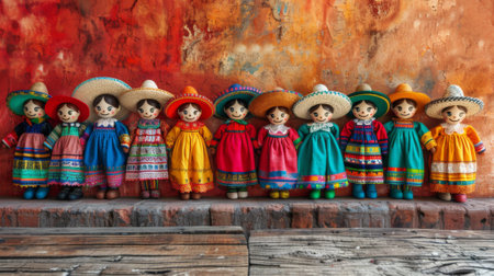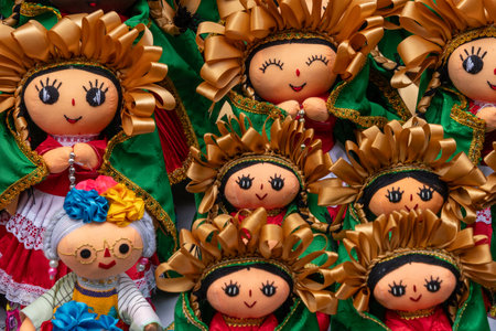 A group of dolls are lined up, some wearing traditional Mexican clothing. The dolls are of various sizes and colors. Decoration to celebrate Independence Day in Mexico, zocalo