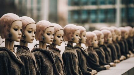 Futuristic retro dummy dolls in the city street Generative AI Illustration.