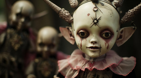 the creepy doll, surrounded by mysterious artifacts, appears to be the centerpiece of a dark ritual, evoking feelings of unease and foreboding, as if it's a portal to the sinister world of satanic cults, where ancient rituals and dark magic reign supreme, casting a shadow of fear and dread. ai generated