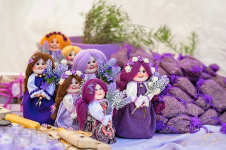 Lavender dolls and souvenirs. Colorful handmade dolls in lavender-themed dresses displayed at craft market. Concept of lavender, handmade art, gift ideas, creative decor