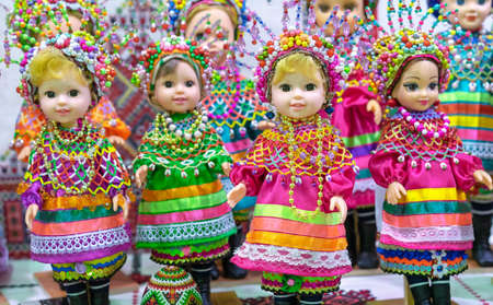 Dolls in bright national Mordovian costumes, a nationality living in Russia.