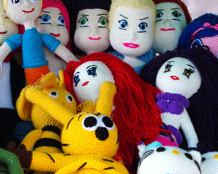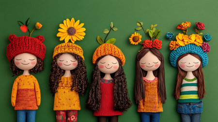 Colorful knitted dolls in various hats and clothes, creating a cheerful and vibrant scene.