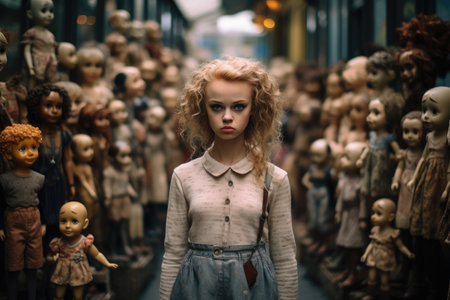 An AI generated illustration of doll surrounded by a large array of doll heads and dresses, showcasing a variety of colors and styles