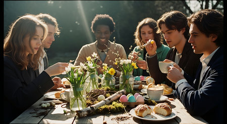 Warm sunlight illuminates an inviting table filled with vibrant, appetizing dishes while friends share laughter and conversation in a lively garden celebration.
