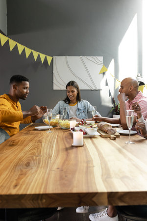 Group of happy young people having dinner at home. Friends having breakfast together.